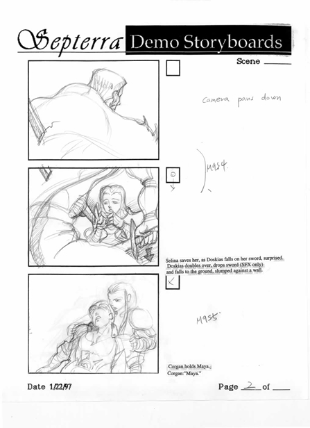 A standard system was developed for the storyboards produced for Septerra Core, which were primarily for the movie sequences (cut scenes). The treatment was developed for the game, which included an overview of the game play, characters, movies and environment. Then storyboards would be produced for it, being reviewed and modified until the auteur or team was satisfied with the scenes, characters, angles, dialogue and clarity.