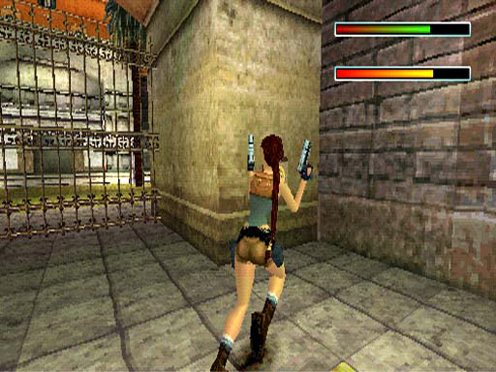 Lara Croft, Tomb Raider jumping through fire, over bottomless pits, and mediums.