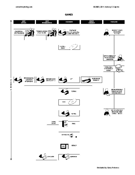 (Click on image to download Hi-Rez version) Many industry professionals believe the garage-based gaming development projects may be a thing of the past. The level of complexity in developing an interactive game, depends largely on what type of game. The more intricate role-playing games (RPG), such as Septerra Core, with 120 hours of gameplay, 154 speaking parts and over 200 sets required a script and software document that fit in two spiral bound notebooks measuring about ten inches thick.