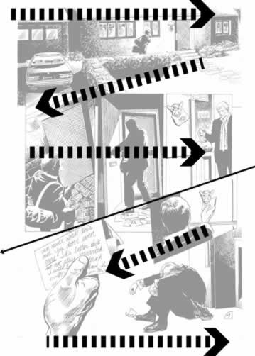 There is an almost subliminal perception of the pictures while the eye is consciously reading the printed words. The eye registers the whole page (sometimes the two-page spread) at once. This overall view does contribute to the visual story unfolding, but the brain usually can’t process all of the information, simultaneously. This is where the artist must focus on a more sequential path from one panel to another. A superbly designed page will include elements that will assist the reader in following the story. The ability to decipher visual images, while reading involves both halves of the brain, whereas the left-side of the brain is more dominate in calculative logic, while the right-side being more visual and creative. This comes easily to some people, not to others. If panel layouts and page design is not easy to follow, the brain gets bogged down trying to decipher it all. If the confusion of the page provokes the reader’s immersion to be lost, they pull back and become left-brain dominant to figure out the mechanics of how to read it. By watching someone's eyes when reading a comic book, is a great way of witnessing firsthand how the comic-reading process works.