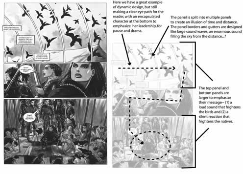 The action flow of the panel should follow the eye path of the reader. This is a great way to emphasize an action and make it seem even bigger or faster. That also makes the opposite true; having the action flow go against the reader's eye path can bring things to an abrupt halt, or even make the reader subconsciously feel an impact.