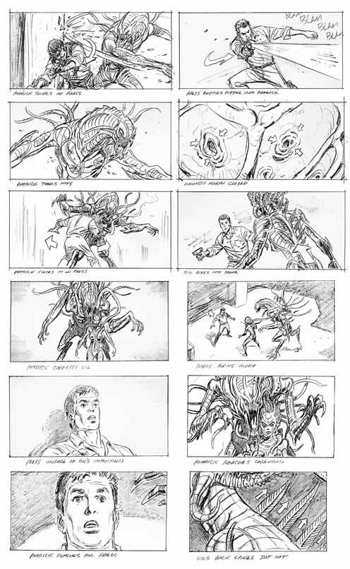 Storyboards are the blueprint for visual sequences of the film. Here Kerry Gammill lays down the foundation for a film sequence in SPECIES II.