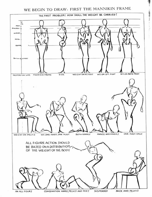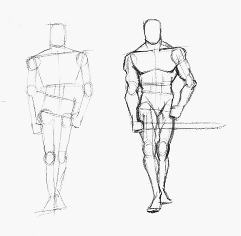 Every figure should be built from some kind of skeletal structure or "manikin," which provides a framework for drawing accurate anatomy and proportions. See the Andrew Loomis section.