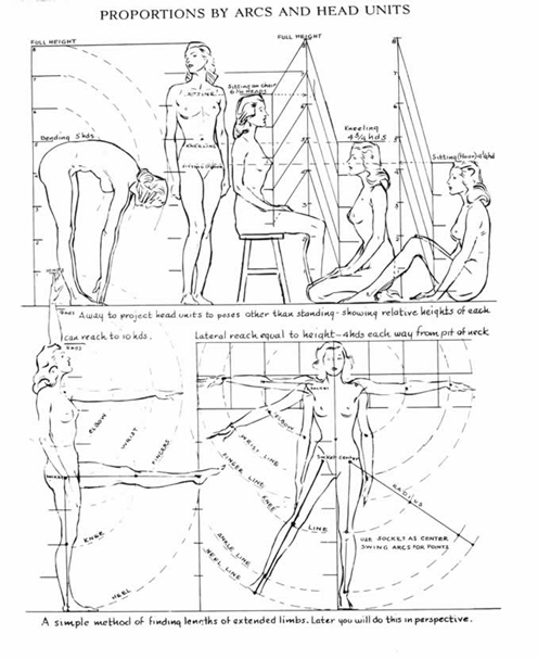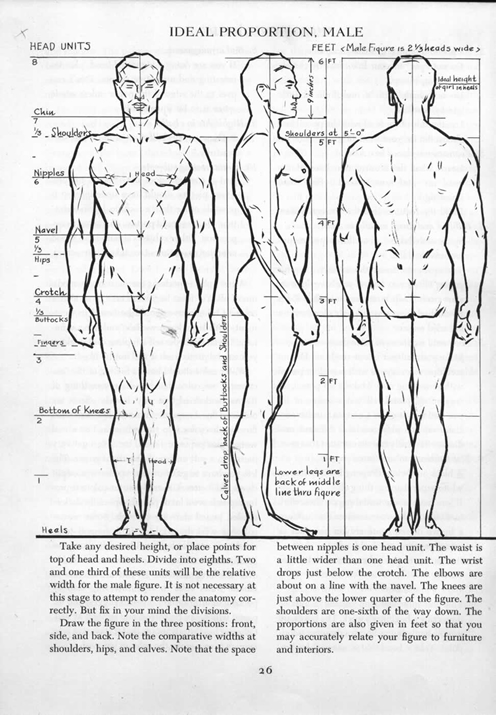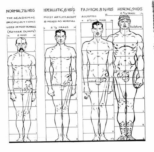 Andrew Loomis was a paramount illustrator of the 1930s and 1940s and is best known for the first art instructional book on dynamic anatomy and fashion illustration that presented the world with the human proportional chart in Figure XX. This book was first published in 1943, and although the many styles and tools of drawing may have changed since then, this framework still holds true to this day and is revered by all who recognize this important contribution to the world of art.