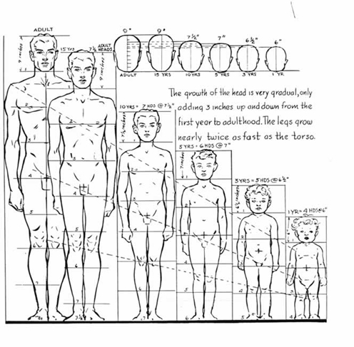 "These proportions have been worked out with a great deal of effort and, as far as I know, have never been put down for the artist. The scale assumes that the child will grow to be an ideal adult of eight head units. If, for instance, you want to draw a man or a woman (about half a head shorter than you would draw the man) with a five-year-old boy, you have here his relative height. Children less than ten years old are made a little shorter and chubbier than normal, since this effect is considered more desirable; those over ten, a little taller than normal — for the same reason."
