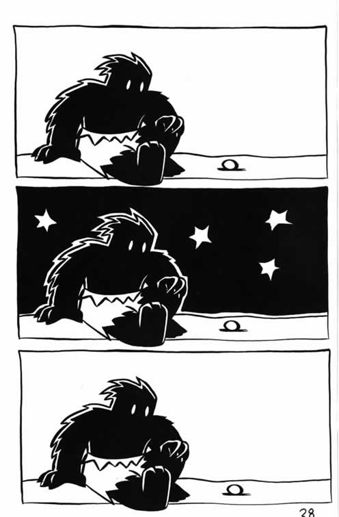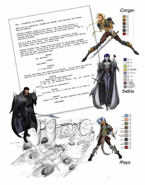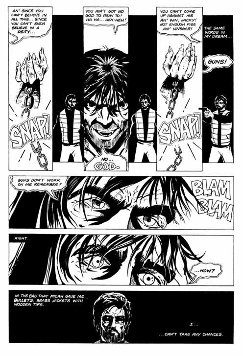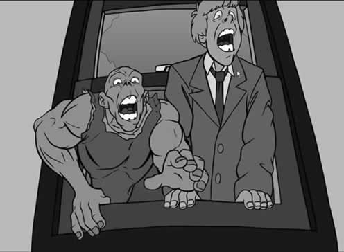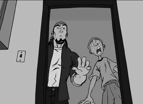 The turning of the page in a comic book is an important timing element, used in many different ways; time lapse, dramatic pause or that all important beat before something jumps out from the shadows. Here, it provides a transition vehicle into the next scene. © 2001 Abstract Studios, All Rights Reserved. Used with permission.