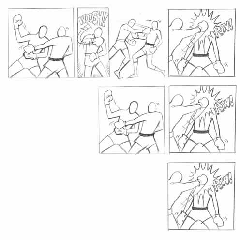 The similarity rests with comics, in the sense that's the extreme, most dynamic shot. In comics, when throwing a punch, it's best to extend the body as far out as possible, without losing that sense of reality, for the most of dynamic energy. "It's at that point that I change the scene with another angle where that punch is in the exact same position that the character being hit, is really on focusing on him, he's going flying. That would make a really nice cut. "