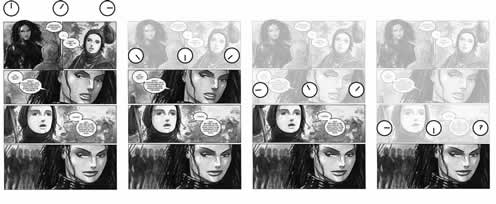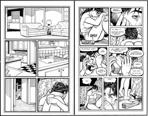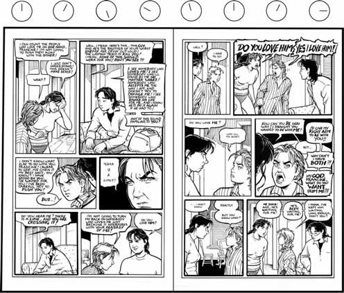 These examples from Terry Moore's Strangers In Paradise shows Francine and Katchoo (the two protagonists) having a loud argument in the other room, while David sits in the living room listening. Moore said that he usually writes a script, but doesn't always follow it. In this particular sequence here, he worked more from the hip. "This sequence came to me while I was designing it; laying it out. I just closed my eyes and pictured the characters arguing, as I was drawing a movie," said Moore. Note that he followed the 180 degree rule (see Chapter 9: Visual Storytelling Rules, for more on the 180 degree rule), where each character stays within their frame space for clarity.