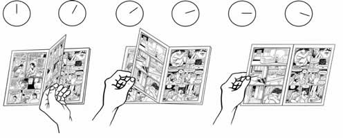 The filmmaker has complete control over the timing and pacing, so it's the responsibility of the filmmaker and his vision that will determine how the audience will experience that story. He will create that clock to outline a specific path and flow that's all about immersion. When experiencing the passive experience of film, there's not much that anyone can do but fall into the story. The filmmaker judges what's important for the audience to take notice of—like the amount of time it takes the protagonist to jump off a building; the filmmaker may show it in slow motion, but the audience has no control of that. As a reader of a comic, this is less passive, and requires active involvement to move the characters and the story along. The reader instills life into those characters, and that's how the artist and the reader communicate. The use of compositional skills within a panel, in between two panels and/or two pages will determine the pacing. An example of how to slow the reader down is by using a larger panel with lots of content detail. On the other hand, a single image in a panel with no or little dialogue and background would speed up the experience. For the most part, things should happen quickly to occupy as little time and space as possible, events that happen slowly, to occupy as much space as possible. That's really the only way to control that vital element of how long the reader looks at something. In order to have the reader pay special attention to scene, comics don't have the advantage of movies, so slow motion is out of the question, although, depending on what the specific scene is, multiple images may create a similar effect (see Chapter 10). There is no sure way to nail the camera down and leave it there (without risking boring the reader) until the reader looked at it. The opportunity is to present important objects or events in multiple panels, but not necessarily as the primary object or event.