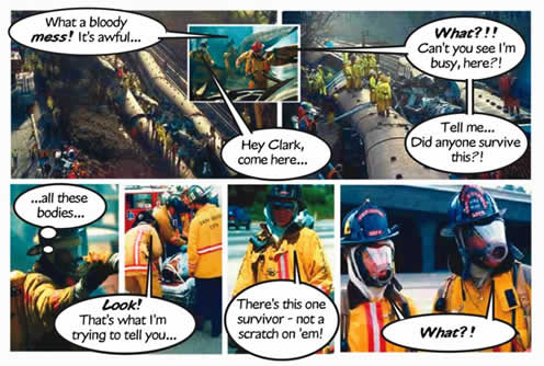 This is an arrangement of random photographs. It works in presenting a sequential story because they're all firemen – a single point of reference — and the continuity of the train disaster established in the first shots.