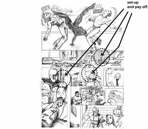 2) The clear eye path flow, in comic books or in storyboards, from one panel to the next panel in the sequence. Keep in mind that a reader will subconsciously follow the eye path into the next panel on the page. Make sure the design does not confuse the reader and send them looking into the wrong panel in a sequence.
