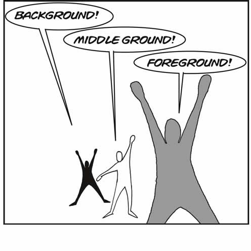 CAPTION: There are three planes that can create the illusion of depth on the flat page or screen – foreground, middle and background. By varying light sources, size and detail, you can create a three dimensional feeling.