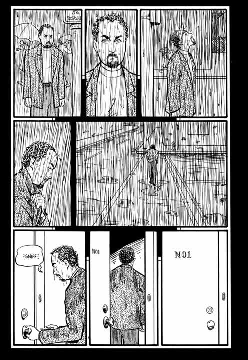 Freddie Femur is a character within the pages of Terry Moore's award winning Stranger's in Paradise. Throughout the dozens of issues, Femur is a louse, and that continuity doesn't waiver for a minute, even here. Moore incorporates a flashback to childhood, drawn in a completely different style, however, you're able to follow the path he's laid out through the continuity of the rain.