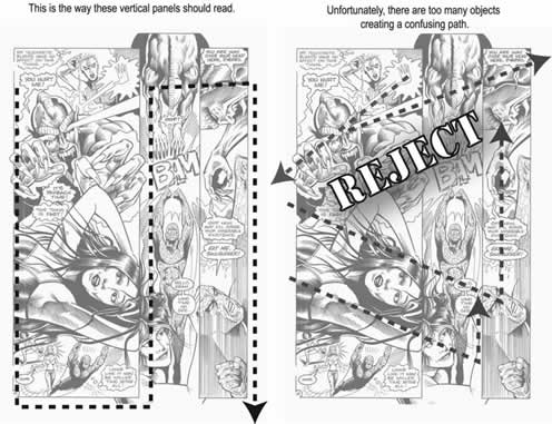 If possible to do without opposing any of the aspects of good storytelling (including maintaining action flow continuity), design panels so the eye easily moves to the next panel in the sequence. This helps with the action and flow of the story, as well as with suspension of the reader's disbelief. If they have to stop and figure out where to go next, then they're lost and the story becomes just a bunch of pictures on a page or dynamic imagery on a screen..