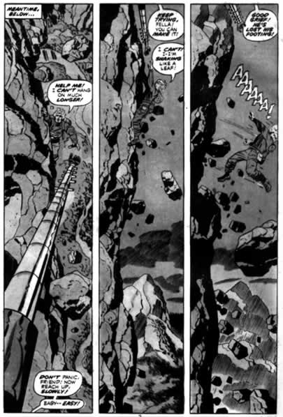 Jack Kirby, a master and innovator of American comics proves it once again here, with a clear use of vertical panels. Not only is the design of the page and panels exceptional clear, but the tall, thin panels also provide a sense of great height.