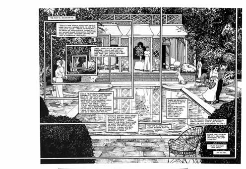 In every visual storytelling medium, there must always be an establishing shot—on that pulls back and let's the audience know what, where and who are in the scene. Figure 9.8 is a two page spread from Terry Moore's Strangers in Paradise, where he used a mortice, used in filming television.