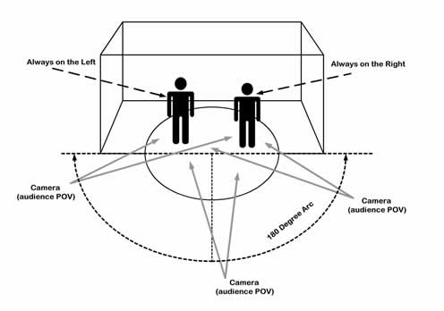 A character should remain on the same side of the scene even if the angle and point of view is reversed, in order to make it easy for the audience to follow the focus of the story, without having to work at following the characters.