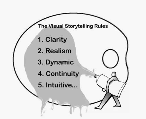 The story should be told visually as clearly as possible except where being unclear is a conscious part of the storytelling. An example of "unclear storytelling" could be about a delirious and confused man has jumbled hallucinations spinning before his eyes. There are no clear thoughts expressed, with no clear eye path to follow, so this creates a desired sense of confusion. It becomes (again) part of the storytelling experience.