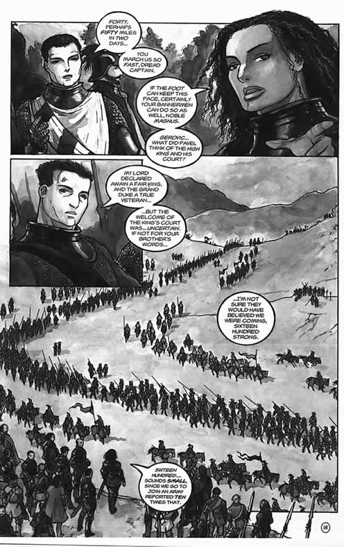 Mark Smylie's Artesia lends itself to a mise-en-scene emphasis as Smylie describes his comic as an attempt at epic military fantasy, and so the visual images have to be panoramic. "The story calls for sweeping vistas showing armies and landscapes, which are best showcased using traditional and relatively simple panel-to-panel page designs. Chopped-up panels and funky page layouts wouldn't work with the story style."
