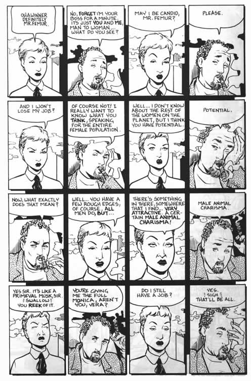 In comics, as in movies, an actor's performance is not acting, it's reacting. It's easy to animate figures, but not so easy to get them to appear involved. Dialogue scenes work when the characters play off of each other's lines - when they listen and react appropriately. Gestures and facial expressions function as "cues" for the reader and help make the scene work. The trick here is to get the pictures to carry the dialogue, and not vice versa.