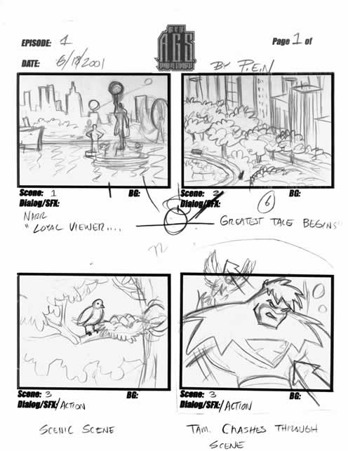 Above is an example creating the characters within the script. Bringing them to life, as a fully developed character through imagery is an important step for any visual media. Although storyboards are simply a foundation for creating a film or animation, they should still clearly tell the story unfolding, otherwise those shortcomings may wind up on film as well.
