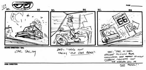 The next step, usually includes a thumbnail or layout rough of the visual story panel by panel, frame to frame or scene to scene. Some artists do this on the original art boards while others first work out the story with "thumbnail" drawings (small layouts). Either way, the panel arrangements and sizes are figured out and stick or balloon figures are used to rough in the storytelling.